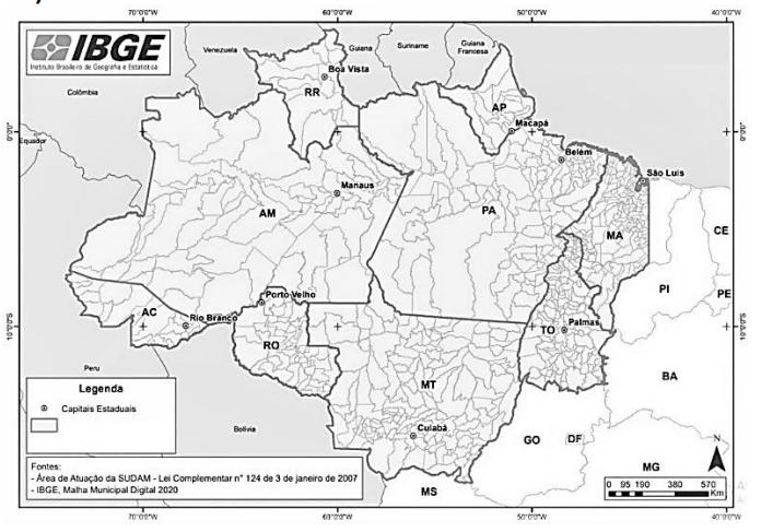 O mapa acima mostra a delimitação geográfica de uma região política instituída com o objetivo de definir a área de atuação da Superintendência do Desenvolvimento da Amazônia (SUDAM). Tal região abrange a totalidade de oito estados brasileiros e a parte do Maranhão localizada a oeste do meridiano de 44º (adaptado de IBGE, 2022). Diante do exposto, assinale a alternativa correspondente ao nome da região apresentada no mapa.