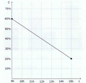 O gráfico abaixo mostra a porcentagem da carga C da bateria de um celular em função do tempo T em horas. No período indicado no gráfico, o consumo da bateria desse celular apresentou comportamento linear, iniciando com 60% da carga total às 9 horas da manhã até atingir 20% da carga total às 15 horas da tarde do mesmo dia.