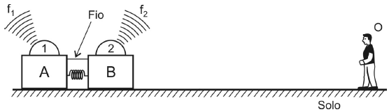 Duas fontes sonoras 1 e 2, de massas desprezíveis, que emitem sons, respectivamente, de frequências f1 = 570 Hz e f2 = 390 Hz são colocadas em um sistema, em repouso, constituído por dois blocos, A e B, unidos por um fio ideal e inextensível, de tal forma que uma mola ideal se encontra comprimida entre eles, como mostra a figura abaixo.