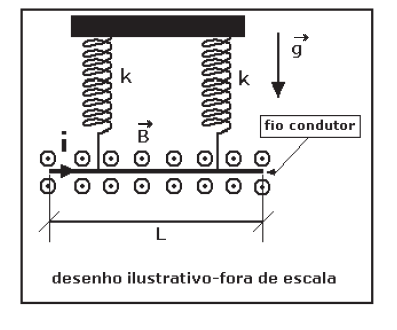 A figura abaixo representa um fio condutor homogêneo rígido, de comprimento L e massa M, que está em um local onde a aceleração da gravidade tem intensidade g. O fio é sustentado por duas molas ideais, iguais, isolantes e, cada uma, de constante elástica k. O fio condutor está imerso em um campo magnético uniforme de intensidade B, perpendicular ao plano da página e saindo dela, que age sobre o condutor mas não sobre as molas.