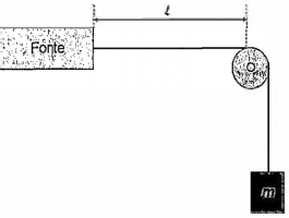 No esquema da figura abaixo, uma fonte coloca uma corda a vibrar, no modo fundamental, com uma frequência de 200 Hz. Considere que a corda seja inextensível e a polia ideal. Considere ainda que a massa do bloco nessa situação seja 4 kg e a distância I igual a 50 cm.