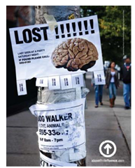 Um cartaz com a imagem de um cérebro (perdido numa festa em algum sábado ____ noite) ilustra com humor a campanha de prevenção ____ drogas da Above The Influence (Partnership for a Drug-Free America). Além de lembrar que quem abusa de álcool ou usa drogas compromete ____ saúde e ____ funções cerebrais, a peça divulga o telefone da entidade, em Nova York. A criação é da agência Vigilante.