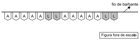 Para enfeitar uma sala de aula, os alunos confeccionaram bandeirinhas, usando somente papéis nas cores azul e laranja. Essas bandeirinhas foram coladas em um fio de barbante, obedecendo sempre à seguinte ordem: 5 bandeirinhas azuis (A), seguidas de duas bandeirinhas laranja (L), conforme mostra a figura.