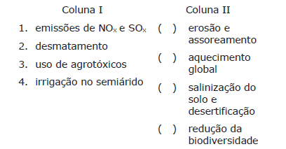 As atividades humanas exercem importante papel na transformação do meio ambiente natural. Relacione corretamente as atividades humanas com seus principais impactos diretos sobre a natureza, numerando a Coluna II de acordo com a Coluna I.