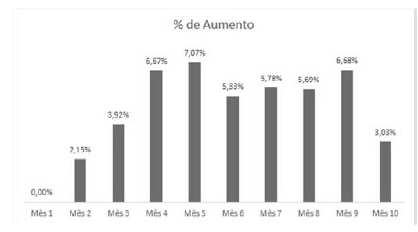 Em determinada cidade brasileira, foi realizada uma pesquisa para analisar a variação do valor do litro da gasolina. No primeiro mês da pesquisa, a gasolina custava R$ 3,25. A partir do segundo mês, o preço da gasolina teve sucessivos aumentos, conforme mostrado no seguinte gráfico.