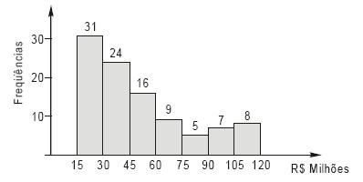 O histograma de freqüências absolutas a seguir foi elaborado com base nas informações contidas na revista "O Empreiteiro", de junho de 2005, que demonstra o comportamento das empresas construtoras do ramo da construção civil no Brasil que obtiveram faturamento em 2004 maior ou igual a 15 milhões de reais e menor ou igual a 120 milhões de reais.