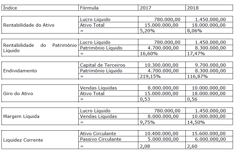 Uma Sociedade Empresária apresentou os seguintes índices para os anos de 2017 e 2018, calculados a partir dos dados de suas demonstrações contábeis: