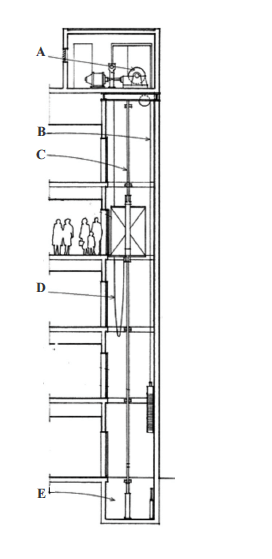 Elevadores elétricos consistem em uma cabine, instalada em trilhos de guia, sustentada por cabos de tração e movimentada por maquinaria elevadora. Na figura acima, que mostra o corte lateral de um sistema de elevador elétrico, estão indicados cinco elementos, de A a E. Assinale a opção que apresenta associação correta entre o elemento e a sua descrição.