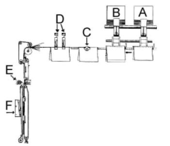 O esquema abaixo representa o acabamento automatizado de uma revista com grampo a cavalo. A seqüência final desse tipo de acabamento está identificada pelas áreas A, B, C, D, E e F.