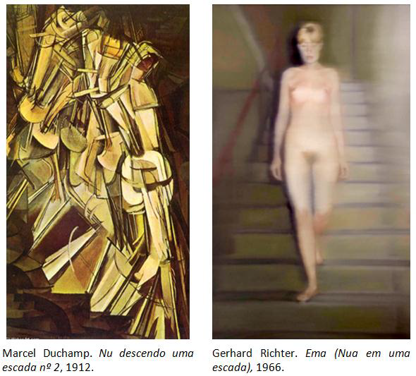 I. Apesar da citação, há diferenças formais entre as duas obras: a figura nua representada no quadro de Richter aparece borrada, em posição frontal, enquanto o corpo em movimento em Duchamp desce em sentido lateral.