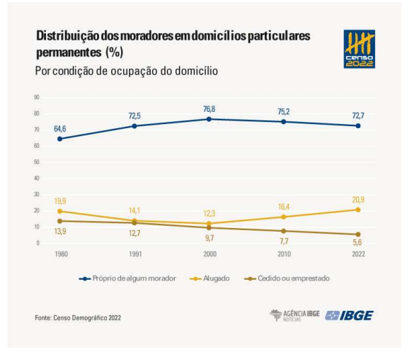 Uma a cada cinco pessoas mora em imóveis alugados no Brasil, número que aumentou nas últimas duas décadas, de acordo com Instituto Brasileiro de Geografia e Estatística (IBGE). A faixa etária entre 25 e 29 anos é responsável pelo pico de imóveis alugados, representando 30,3% do total da população que vive no aluguel. Ainda assim, a maioria dos brasileiros (72,7%) reside em domicílios próprios, de propriedade de algum dos moradores.