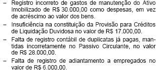 No curso de auditoria externa realizada na Cia. Novo Hamburgo foram constatadas as seguintes irregularidades: