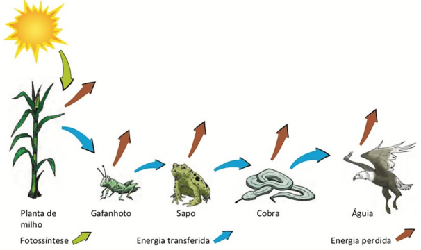 Numa cadeia alimentar o fluxo de energia é unidirecional. Além disso, a cada transferência de energia através de um nível trófico para outro, há sempre perda de energia na forma de calor. Por isso, a quantidade de energia diminui no decorrer das relações tróficas. Assim, quanto mais próximo do produtor, maior a quantidade de energia disponível.