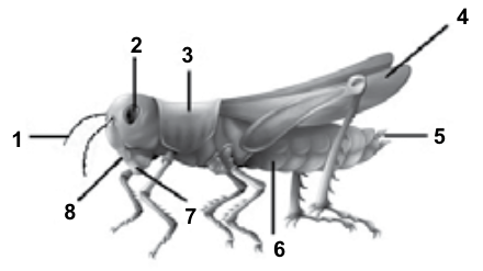 O gafanhoto é um inseto que desempenha papel importante no ambiente. No entanto, em determinadas condições, ele pode se constituir em uma praga devido ao seu modo de vida. São hemimetábolos e, em sua maioria, herbívoros, que podem causar danos às plantações. A seguir, a ilustração de um gafanhoto com a indicação de algumas partes de seu corpo indicadas de 1 a 8.
