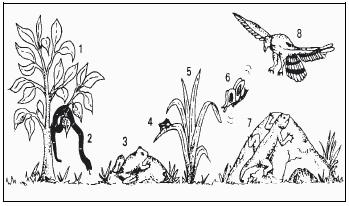 No ecossistema a seguir esquematizado, estão representados, de 1 a 8, os componentes de uma comunidade biótica. Entre eles encontram-se: produtores, consumidores primários, secundários e consumidores terciários.