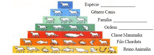 Considerando a claddificação dos seres vivos e as regras de nomeclaturas biniminal e exemplificando com o cão doméstico, assinale a alternativa em que as lacunas da espécie, familia e ordem estão corretamente preenchidas.