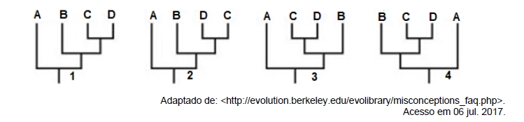 Considere os cladogramas abaixo. Ao analisar as filogenias hipotéticas, é correto afirm...