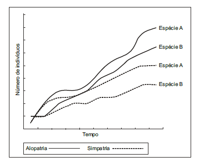 nula, pois ambas continuam apresentando aumento populacional, embora com menor velocidade que em alopatria.