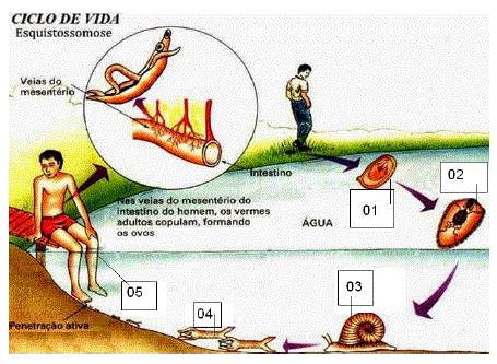 A esquistossomose mansônica (CID 10ª Rev. B65.9), também conhecida como “xistose”, “xistosa”, “xistosomose”, “doença dos caramujos” ou “barriga d’água”, é uma doença parasitária causada por um trematódeo, Schistosoma mansoni, com evolução clínica que pode variar desde formas assintomáticas até quadros graves. É uma doença de veiculação hídrica e está relacionada a deficiências no saneamento básico, tais como despejo de dejetos humanos sem tratamento em córregos, rios, lagoas ou outras coleções hídricas. Considere a sequência numérica relacionada ao ciclo do Schistossoma monsoni, apresentada na figura abaixo.