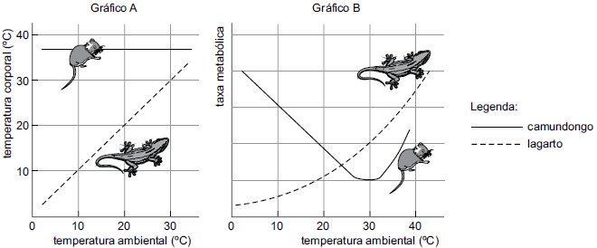 Com relação à fisiologia da termorregulação dos vertebrados, é possível diferenciar os animais capazes de manter a temperatura elevada pela produção interna de calor e os animais que dependem de fontes externas de calor. A taxa metabólica exerce um papel fundamental nesse controle térmico, conforme ilustra os gráficos a seguir.