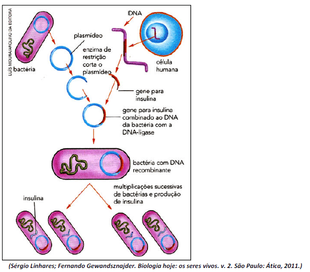 O esquema a seguir mostra a produção de insulina por meio da técnica de engenharia genética.