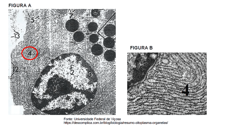 Na Figura A temos uma micrografia eletrônica do pâncreas. Em destaque (no círculo indicado pelo número 4) vemos uma importante organela, a qual está ampliada na Figura B. Qual é essa organela e o que o desenvolvimento desta nos permite inferir quanto à atividade metabólica da célula?