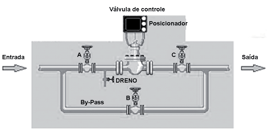 Se a válvula de controle estiver aberta, uma das possibilidades de o fluido na entrada NÃO chegar à saída ocorre quando as válvulas A, B e C estão, respectivamente,