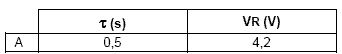 Em um circuito RC série, em que R = 10 kΩ e C = 100 μF, é aplicada uma tensão DC de 10 V. A constante de tempo τ do circuito e o valor aproximado da tensão VR no resistor, após um intervalo equivalente a τ, considerando que, no instante em que a tensão DC é aplicada, o capacitor encontrava-se totalmente descarregado, são: