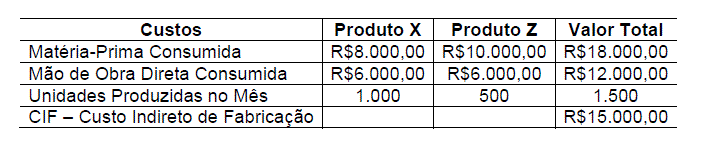 Sabendo-se que a indústria distribui seus custos indiretos de fabricação de acordo com as unidades produzidas, os custos unitários dos produtos X e Z são, respectivamente: