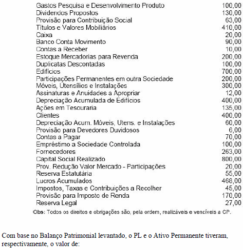 Para levantar um Balanço Patrimonial segundo a Lei nº 6.404/76 (Lei das Sociedades por Ações), foram fornecidos os seguintes dados: