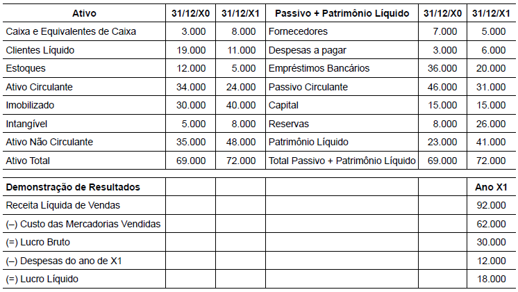 Observe a seguir os balanços patrimoniais sintéticos da Comercial Sorrento, em 31/12/X0 e 31/12/X1, e da demonstração de resultados sintética de X1 que seguem: