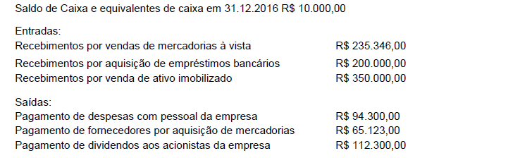 Uma empresa comercial apresentou as seguintes informações para a elaboração da demonstração dos fluxos de caixa referentes ao exercício de 2017: