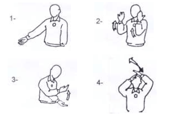 A opção que relaciona, na seqüência, os sinais manuais oficiais do árbitro é: