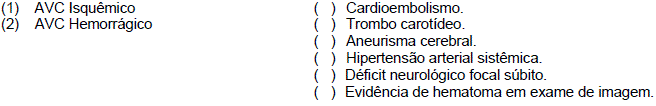 Considerando a etiologia e o quadro clínico dos subtipos isquêmico e hemorrágico, numere a segunda coluna de acordo com a primeira.