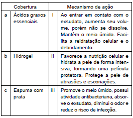 Considere as diferentes coberturas utilizadas no tratamento de feridas e correlacione as colunas do quadro a seguir, de modo a tornar verdadeira a associação entre o tipo de cobertura e seu mecanismo de ação.