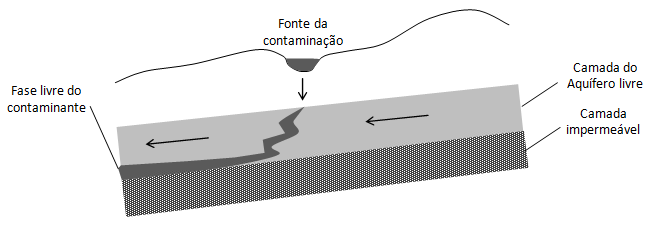 No desenho, as setas indicam a direção de escoamento, a superfície cinza escura mostra a fase livre do contaminante e a superfície cinza clara mostra a água subterrânea no aquífero livre.