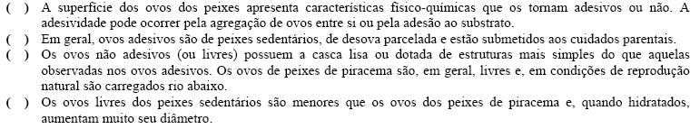 Na natureza, os organismos têm adaptações que os permitem reproduzir e perpetuar. Estas adaptações podem ser observadas em ovos de peixes. Em geral, estes tipos de ovos assumem variadas formas que os capacitam à disseminação e à sobrevivência no local onde será depositado. Quanto aos ovos de peixes em água doce, considere as afirmativas abaixo e marque V para as verdadeiras e F para as falsas: