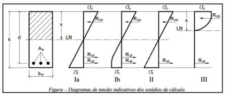 De acordo com a NR 6.118 – Projeto de estruturas de concreto – Procedimento, “estádios” podem ser definidos como os estágios de tensão pelos quais um elemento fletido passa, desde o carregamento inicial até a ruptura. A imagem descreve o comportamento de uma viga simplesmente apoiada submetida a um carregamento externo crescente a partir de zero.