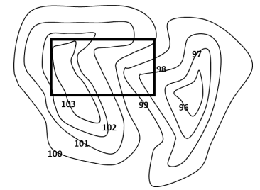 A figura a seguir mostra as curvas de nível de uma região dentro da qual se situa um lote, representado pelo retângulo.