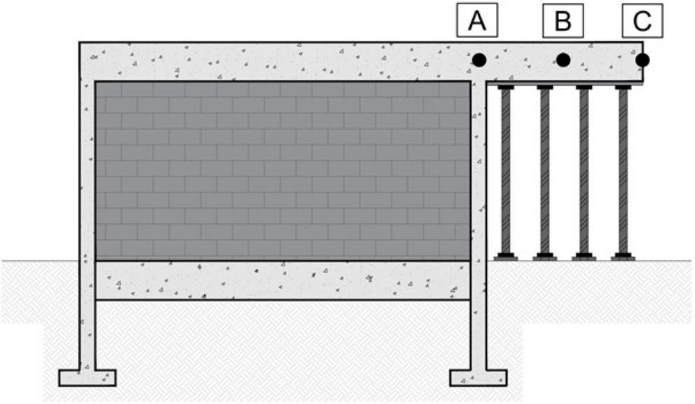 Deve-se retirar as escoras de forma sucessiva, iniciando-se no meio do vão (ponto B) e progredindo até as extremidades (pontos A e C).