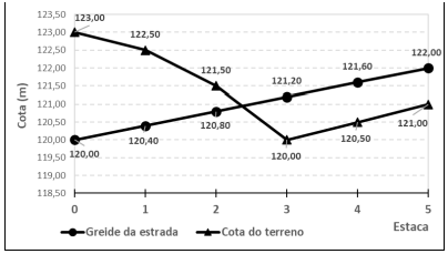 A figura a seguir mostra as cotas do greide e do terreno natural entre as estacas 0 a 5 de uma estrada, onde se adotou o estaqueamento padrão de 20m.