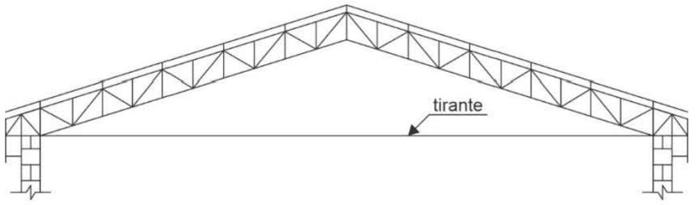 O equilíbrio da tesoura é garantido por uma barra redonda de aço MR250 trabalhando como tirante que liga suas extremidades, por um sistema de rosca e porca. A força de tração de cálculo no tirante é igual a 80 kN. Considerando a combinação das ações normais no estado-limite último e que a resistência à ruptura do aço MR250 é igual a 400 MPa, a área efetiva mínima da seção transversal do tirante é