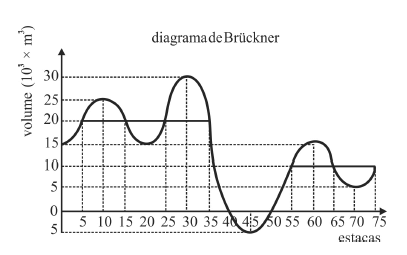O diagrama de Brückner precedente foi utilizado na realização de um projeto de terraplanagem no intervalo entre as estacas 0 e 75 do trecho de uma rodovia. Com base nesse diagrama, é correto afirmar que, no trecho representado,