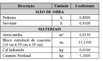 A tabela apresentada indica a composição de insumos por m² de alvenaria estrutural para determinada obra.