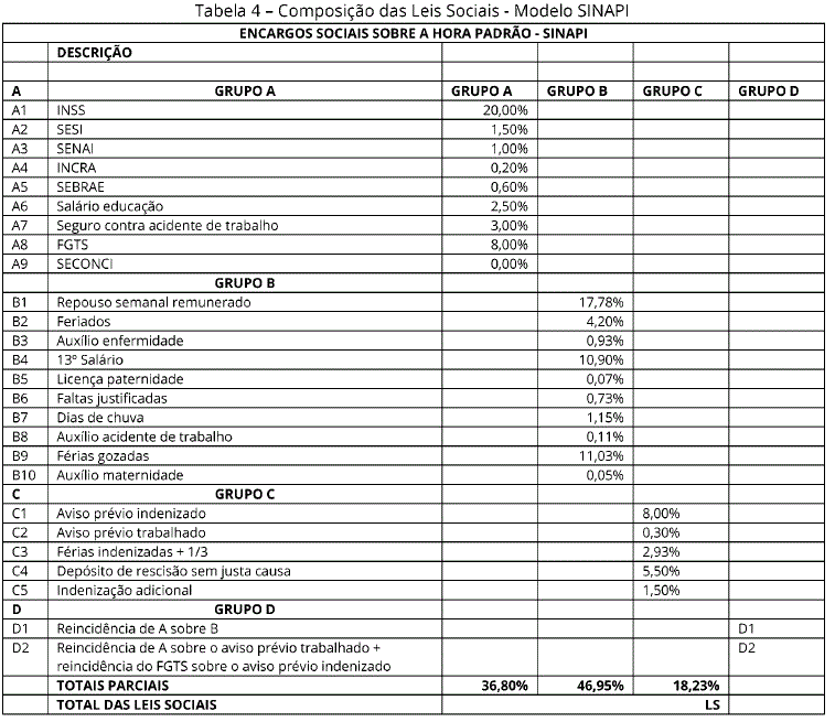 Considerando-se os modelos do Sistema Nacional de Pesquisas de Custos e Índices da Construção Civil - SINAPI e tendo por base a Tabela 4, sobre encargos sociais para horistas, escolha os valores corretos para as parcelas D1 e D2 e para o e valor final das LEIS SOCIAIS.