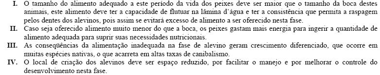 A produção de peixes como atividade comercial vem se expandindo ano a ano no Brasil conjuntamente com o crescente desenvolvimento e melhoria das técnicas de piscicultura, particularmente as práticas relacionadas com a produção de alevinos. Sobre os alevinos, analise: