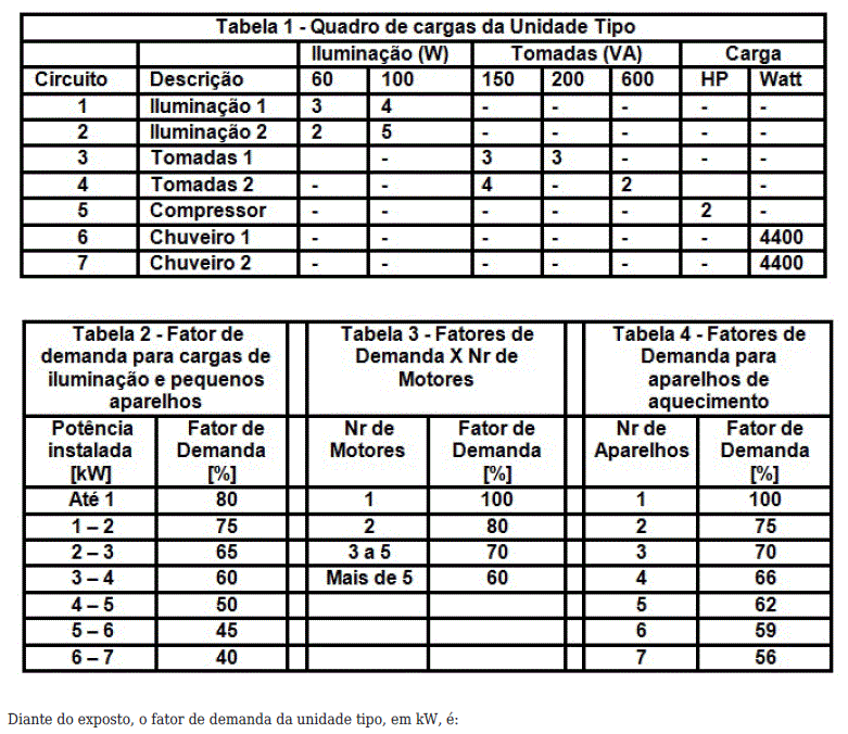 O quadro de cargas das instalações de uma unidade tipo de um edificio residencial é apresentado na Tabela 1. Os fatores de demanda relativos aos equipamentos instalados nessa unidade são apresentados nas Tabelas 2 a 4.