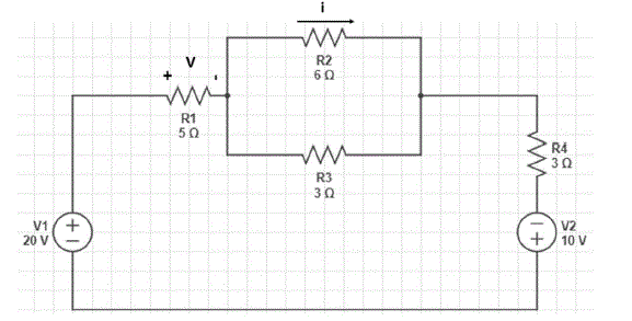 Assinale a alternativa que apresenta correta e respectivamente o módulo da tensão V no resistor R1 em volts e da corrente i no resistor R2 em amperes.