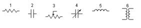 1- resistor; 2- capacitor fixo; 3- potenciômetro; 4- capacitor variável; 5- indutor; 6- transformador.