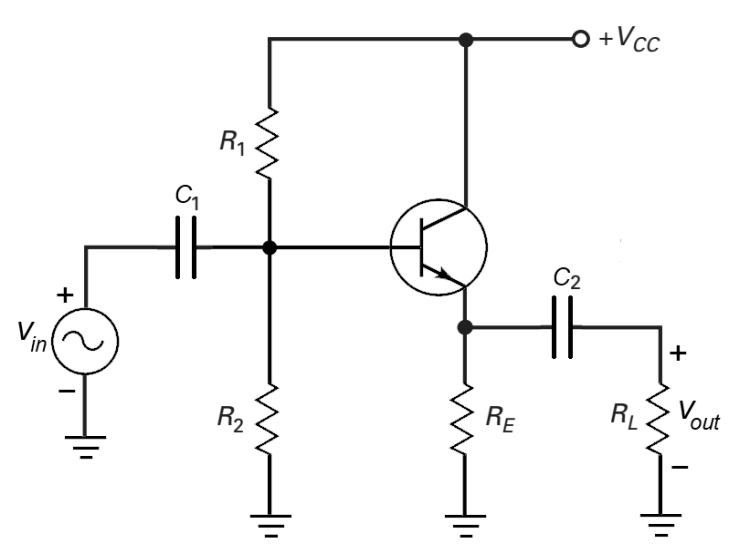 O circuito acima ilustra um amplificador a transistor, utilizando a configuração denominada “coletor comum”. Os capacitores contidos nesse circuito funcionam como curto-circuito nas frequências relevantes dos sinais a serem amplificados, e os componentes são escolhidos, dimensionados e conectados de forma que fazem que o transistor opere de forma correta, na região ativa, e de forma que o amplificador funcione de forma efetiva como um amplificador em “coletor comum”.